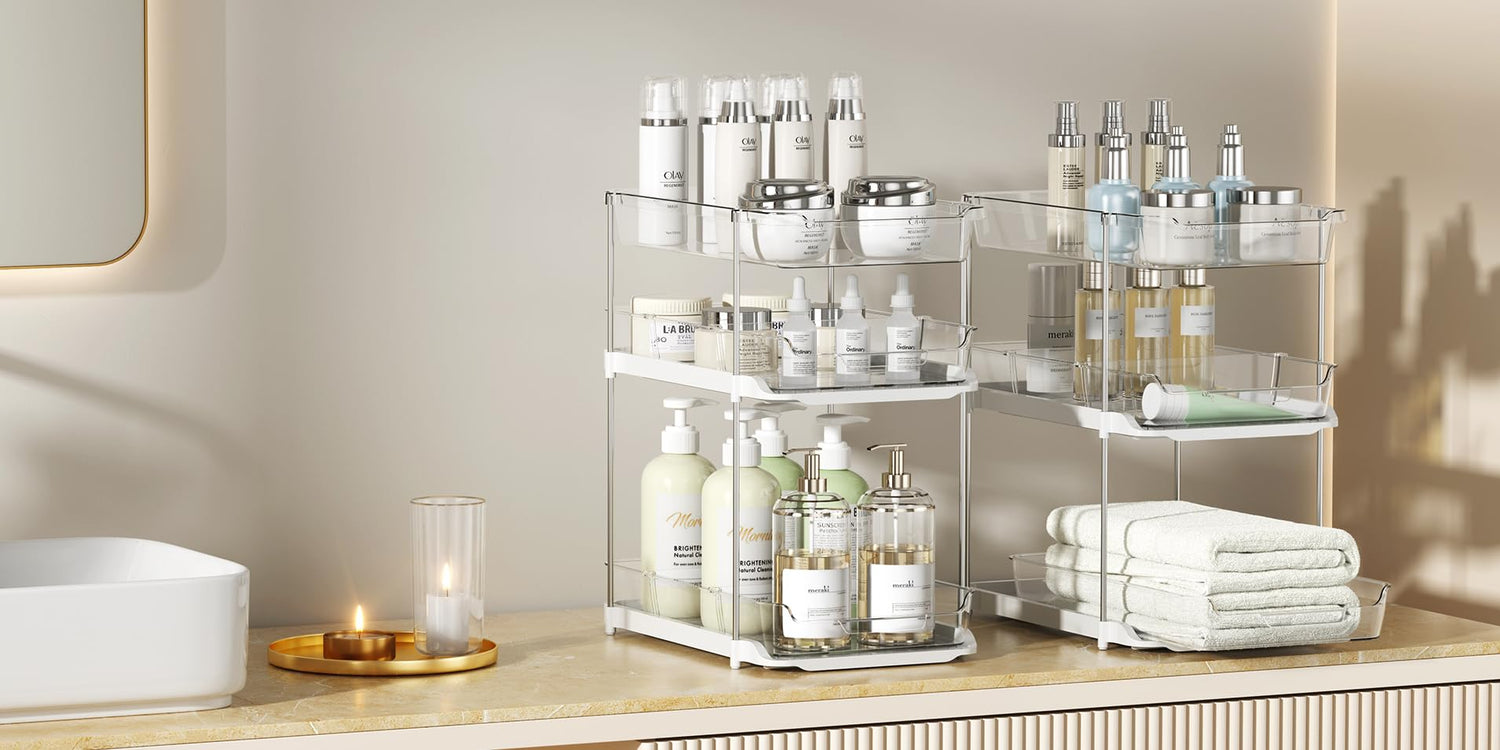 3 Tier Pull-Out Under Sink Organizer Storage, Delamu Bathroom Stackable Pantry Counter Sliding Cabinet Organization and Storage, 2 Sets